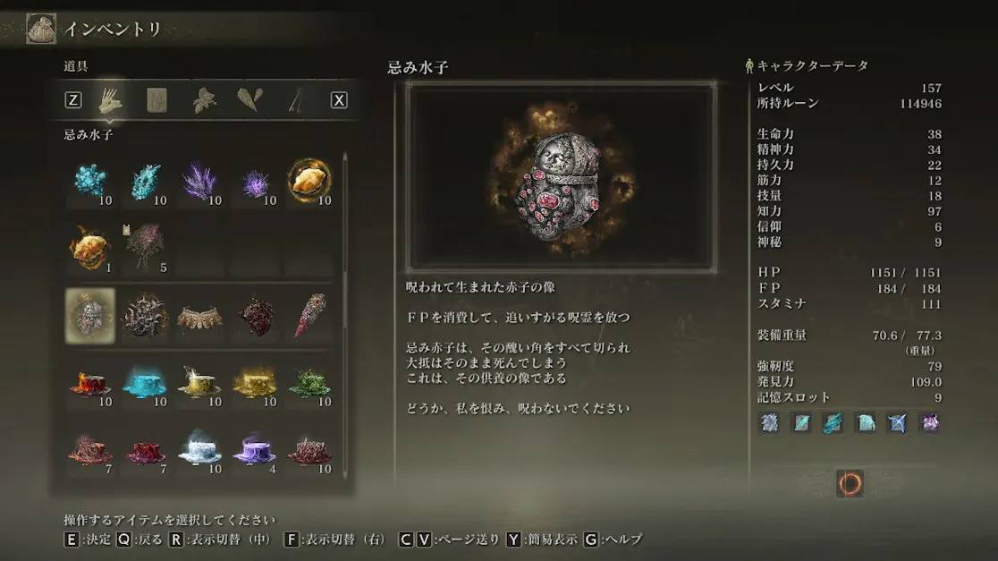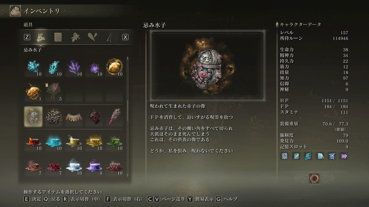 角が生えてしまう忌み子という存在について、その詳細は詳しく語られないが、以下のアイテムのテキストからすると、それは狭間の地の生命のあり方故にそうなったという可能性がある。