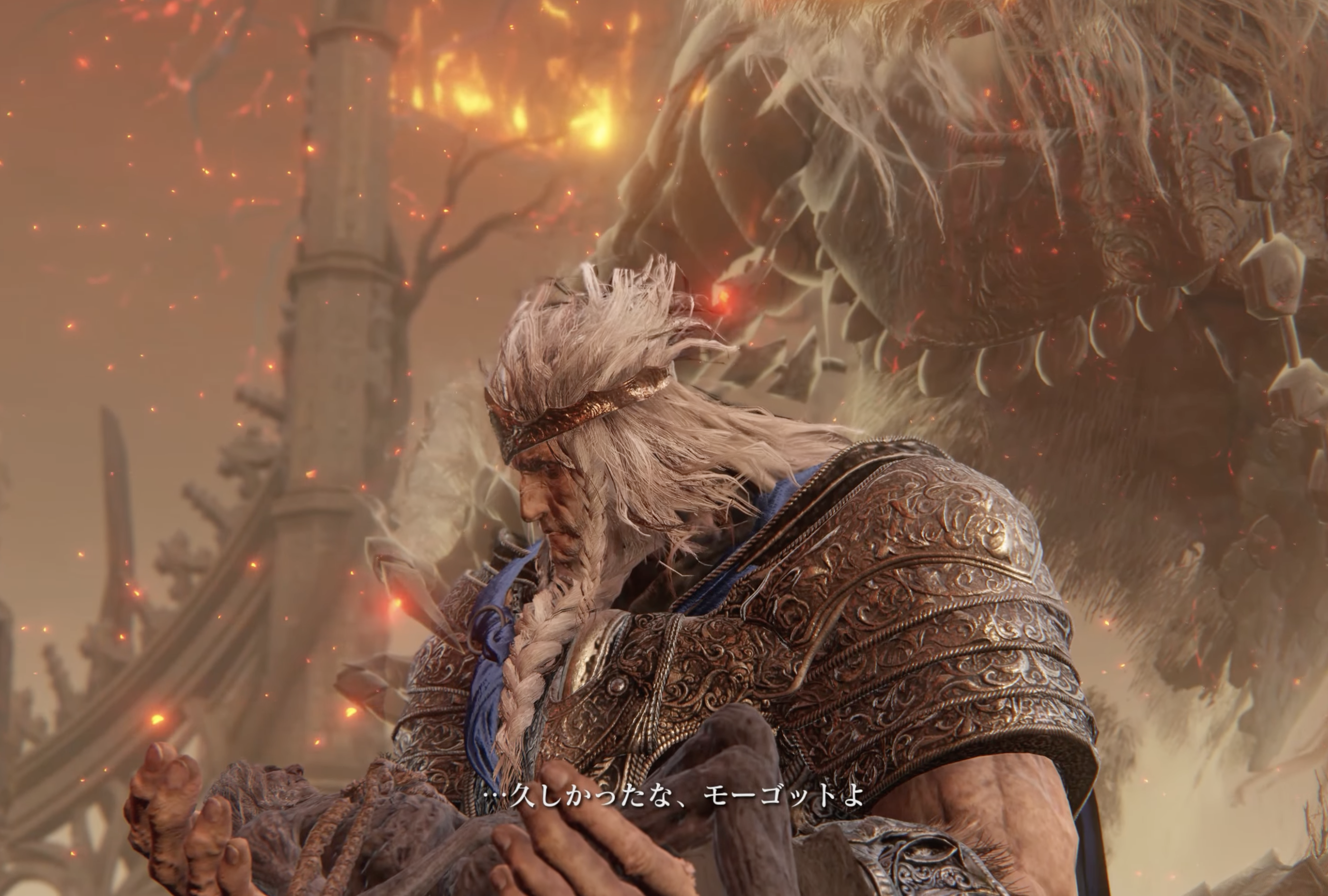 ここで、ゴッドフレイはモーゴットの父ちゃんなんですよな。モーゴットは忌み子で地下に幽閉されていたので、家庭円満な幼少期を送っているはずがない(そもそもそういう概念があったりするのか謎だけど、レナラとラニにはそのような関係があったことが伺える)。一方ゴッドフレイは祝福を奪われて狭間の地を追放された…… ということを考えると、戦い抜いて死したモーゴットが、再会した父に褒められているシーンであるということが分かる。